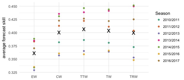 We measured performance by computing the average score across all targets and all relevant weeks in the last seven seasons. (Including only “relevant weeks” means, e.g., that for evaluating season onset we exclude weeks after the onset has clearly occured, because at this point, the forecasts are no longer informative.) The ensemble models generally showed better average scores than any of the component models, and there was little difference between the CW, TTW, TW, and TRW models.